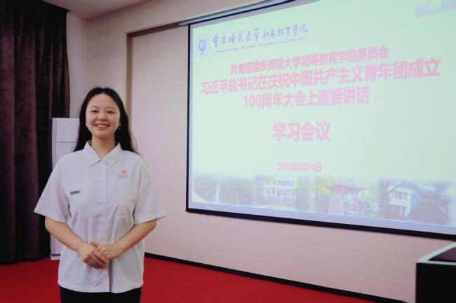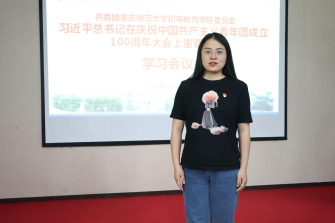 在庆祝中国共青团成立100周年大会上,习近平总书记回顾了建团百年的历史。让我印象最深刻的,是不同的时代,共青团为争取民族独立、人民解放和实现国家富强、人民幸福义无反顾贡献力量。他们在中国革命中、在祖国建设中、在改革开放和社会主义现代化中贡献青春,这也启发我,应该以青春之我成就青春之中国,在今后的团支部建设中,我也将认真贯彻落实习近平总书记在庆祝中国共青团成立100周年大会上的重要讲话精神,不负习近平总书记对青年人的殷切嘱托。
