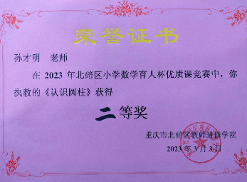 一年春好处,不在浓芳。近日,在北碚区进修学院主办的“北碚区小学数学育人杯优质课竞赛”中,我院附属小学青年教师孙才明执教六年级课程《认识圆柱》荣获二等奖,江春、吴哲学荣获指导老师二等奖。