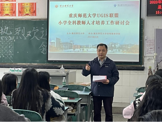 为了进一步推进“UGIS”小学全科教师人才培养联盟各项工作顺利开展,更新小学全科教师人才培养模式,4月6日下午2点,学院在逸思讲堂举行了“UGIS”联盟小学教育(全科教师)人才培养工作研讨会。市教委师范处副处长王晋、二级调研员田静以及我校副校长杨如安出席了会议。学校有关职能部门科室负责人、学院领导班子以及长寿、江津等15个区县教委分管领导和人事工作负责人参加了此次研讨会。会议由学院党委书记陈祖权主持。