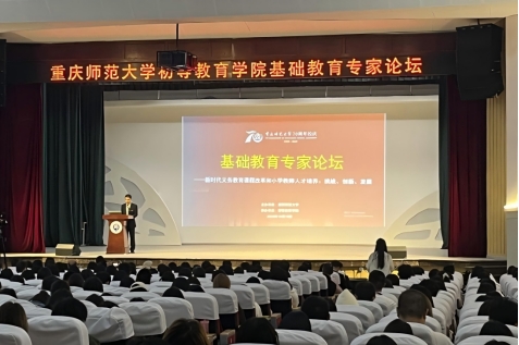 上午09:00,基础教育专家论坛在初等教育学院学生活动中心如期举行。学院三名优秀校友——重庆市北碚区朝阳小学校党总支书记、北碚区两江春晖小学党支部书记、校长赵铭;重庆市沙坪坝区育英小学(重庆大学附属小学)校长钱小波;重庆市大足区宝顶镇实验小学党支部书记、校长刘圣萍依次以《从全局思考到协同行动:共创学校科学教育新格局》、《AI新时代教育理想之变》、《教育家精神指引下的好老师成长之路》为主题作了主旨报告。学院院长冉亚辉教授以《夯实基础、尊重天赋、宽容差异、全面育人:高质量基础教育基本要求》为主题作了主旨报告。返校校友代表以及师生代表600余人参加了此次论坛。