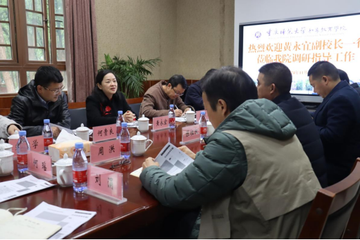 11月26日下午,学校党委常委、副校长黄永宜带领党政办、基建处、后资处、财务处、国内合作与联络中心、发规处等职能部门负责人及相关人员到北碚校区调研“一校三区”联动工作,检查指导PA视讯各项工作推进情况。学院党政领导班子及相关科室负责人陪同调研。