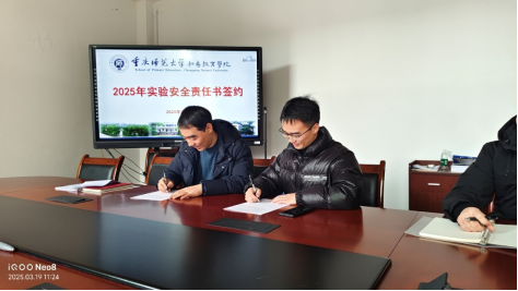 钟绍波主任首先介绍了2024年实验中心工作情况以及2025年实验中心主要工作任务等。随后李秀明副院长传达了学校2025年春季学期实验室安全管理工作会精神,强调了本科教育教学审核评估的重要性以及对审核评估期间实验室工作要点。最后,李秀明副院长代表学院与实验中心工作人员签署实验室安全目标责任书,并检查了计算机、科学、化学等实验室的安全工作。