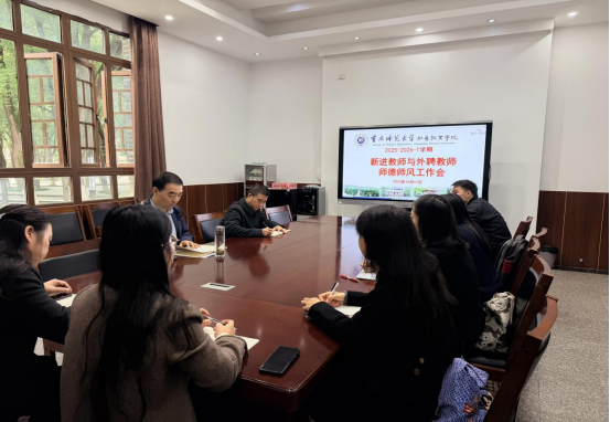 2025年10月31日上午,我院组织召开新进教师与外聘教师师德师风工作会,学院党委书记陈祖权、副院长李秀明、教科办主任黎朝红、新进教师和外聘教师出席了本次会议。