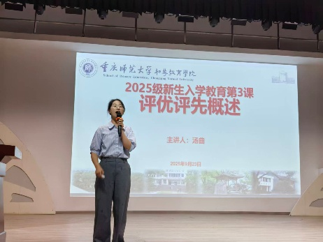 市级评优评先政策讲解中,汤曲老师重点介绍市级三好学生、市级优秀学生干部、市级优秀毕业生、市级先进班级集体的基本评选条件,并特别指出:市级荣誉参评需以获得校级相应荣誉为基础。讲座尾声,她鼓励新生珍惜大学时光,积极参与评优、刻苦学习,现场新生互动踊跃,讲出自己所理解的举办评选活动的激励个人、提高素质意义。
