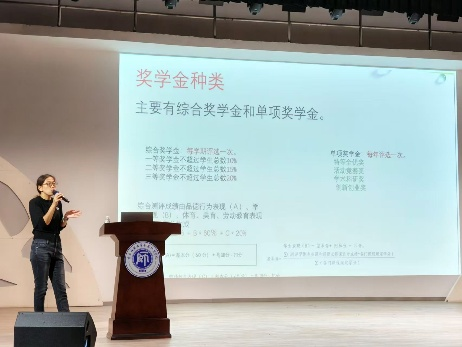 图为王日欣老师讲解资助工作及奖学金评定