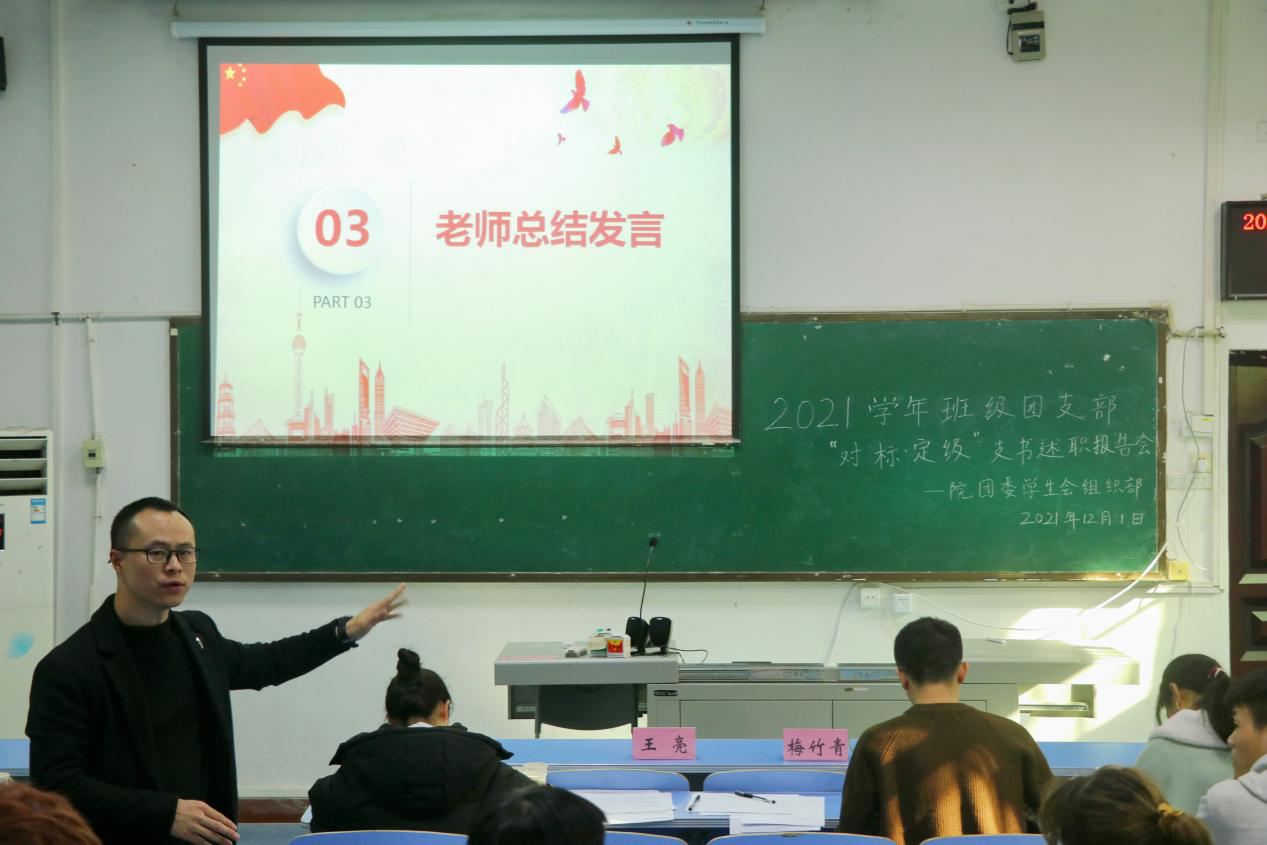 最后,王亮老师进行总结,他对各支部工作予以高度赞扬,肯定了各支部所付出的努力和取得的成绩,坚定了各团支部努力奋斗、再创佳绩的决心。他提到开展支书述职报告会是为了促进支书之间工作交流,是对支书的自我监督与推动,各支部间应该相互学习、相互借鉴、共同发展,并希望同学们能够在团支部工作中得到历练与提升,能继续发扬各支部的积极精神与独特风格,争取在下一年把团支部的工作做得更好,在下一年的支书述职报告中展示更多的成果。