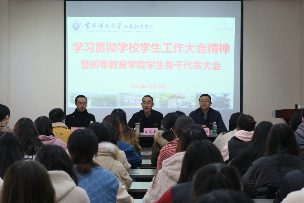 随后,学院党委副书记陈洪伟老师传达了学校学生工作大会精神,并结合学校学生工作六大行动计划,对进一步落深做细学院学生工作提出明确要求。第一,强化思想引领,引导学生树立鸿鹄之志,坚定终身从教信念,树立争当教育名师的职业理想。学院着力开展好“国旗下话成长”、“我的梦教师梦”、“先进事迹报告会”等思想教育品牌活动,用榜样示范引领学生成长;第二,强化文化育人,传承“积极学习、团结拼博”的教室文化和“干净整洁、温馨和谐”的寝室文化传统,营造爱学习、爱生活的浓厚校园氛围,引导学生爱校成才跟党走。学院着力开展好明星班级、文明寝室、教室文化节、寝室文化节等,让学生在浓郁的校园文化中浸润成长;第三,强化活动育人,任何学生活动都要有思想性,要弘扬社会主义核心价值观,实现个人思想与专业技能双提升,实现活动育人。学院着力开展好一日三练(早间晨读、晚间书写与能力一刻)、师范生技能大赛、社团文化节、开学典礼与毕业典礼、科技运动会、体育比赛(田径运动会、篮球、足球、排球、拔河等比赛)、文艺汇演与剧幕展演、演讲辩论、院刊编辑(《执烛者》、《缙云风》、《STEM学习荟》等活动,做到年年有大型活动、月月有主题活动、周周有素质活动、天天有实训活动,实现育人活动化和活动化育人。第四,强化管理育人,一切学生管理工作都是为了学生的学习和成长,任何管理工作都不偏离这个目的和宗旨。学生骨干应带头遵守学校、学院相关管理制度,严格执行学院日常管理、奖助评定、评先评优等制度,积极建议献策,定期完善和补充相关管理制度。学生会各部门应提高管理水平,应将出勤、归寝、清洁卫生等方面管理落细落小,增强育人实效。第五,强化服务育人,人人都要有服务意识和奉献意识,作为未来的人民教师,更需要强化服务意识与奉献意识。学生骨干在服务同学的过程中,要有温度,更要适度,达到帮助同学、教育同学的双重效果。学院要着力发挥学院心理工作站、生涯工作站和宿舍园区工作站的服务功能,还开展好逸师公益课堂、每月益剪、三下乡志愿服务等公益品牌服务活动,增强服务育人实效。