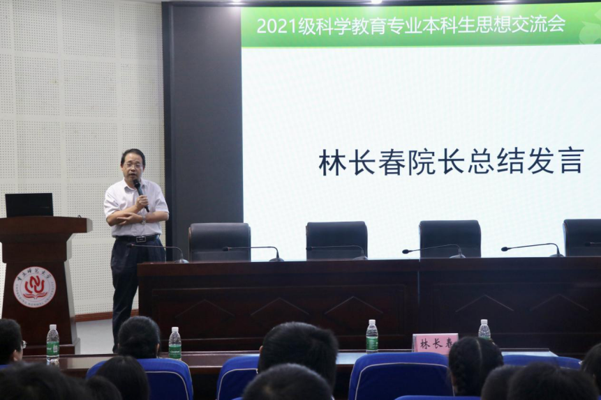 最后,林长春院长总结发言。他希望新同学们向科教专业的优秀校友学习,热爱科教专业、扎根科学教育,培养开拓创新精神;在学好理论、学好基础的同时也要提升动手能力、实践能力,具备良好的科学教师素养。同时他也祝福新同学们学业有成,实现人生梦想,为国家兴旺做出贡献。