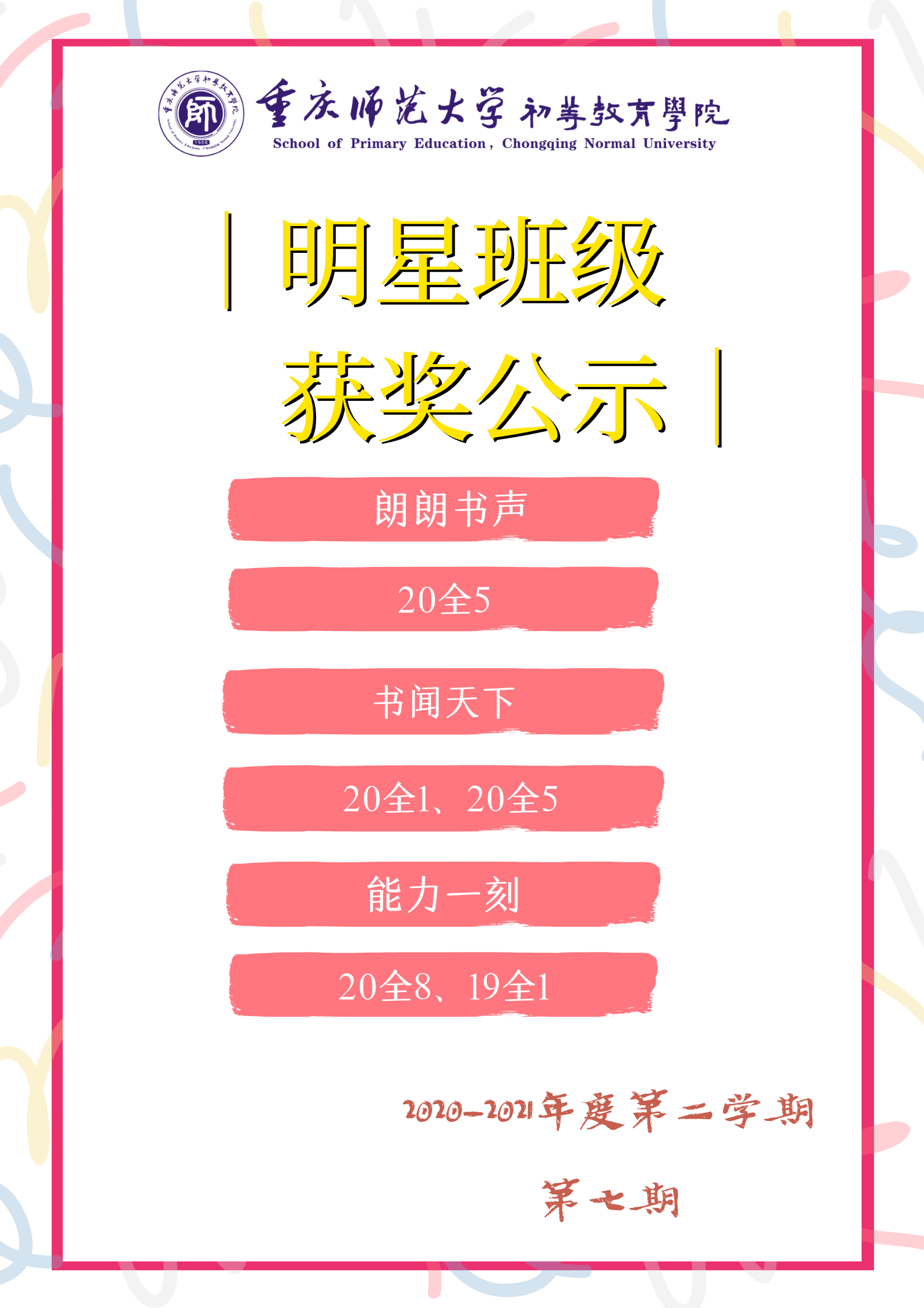 为了促进同学们更好地进行早晚自习,发扬初教院一日三练的优良传统,激励广大同学努力学习、奋发向上,PA视讯PA视讯特举办明星班级评选活动。现公布第七期“明星班级”获奖名单: