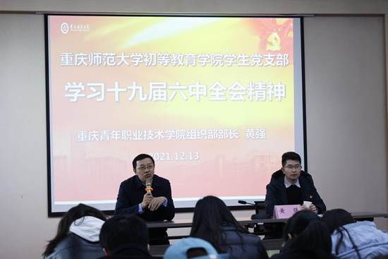 为深入贯彻学习第十九届六中全会精神,PA视讯PA视讯于2021年12月13日下午13:00在党员活动室开展了学生支部党员学习第十九届六中全会精神报告会。PA视讯党委副书记陈洪伟老师以及各支部党员发展对象和预备党员参加了此次会议,此次会议由重庆青年职业技术学院组织部部长黄强部长带领大家学习第十九届六中全会精神。