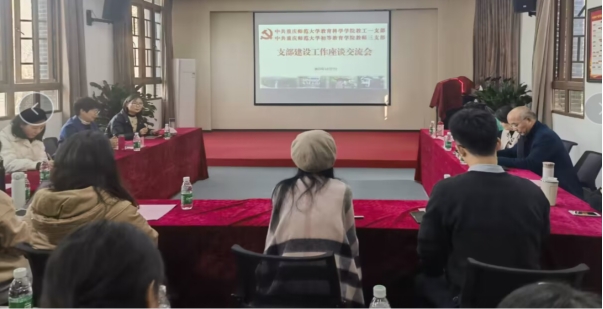 2023年12月7日下午,学院教师三支部与学校教育科学学院教工一支部在学院办公楼党员活动中心举行了联合党建座谈交流会。