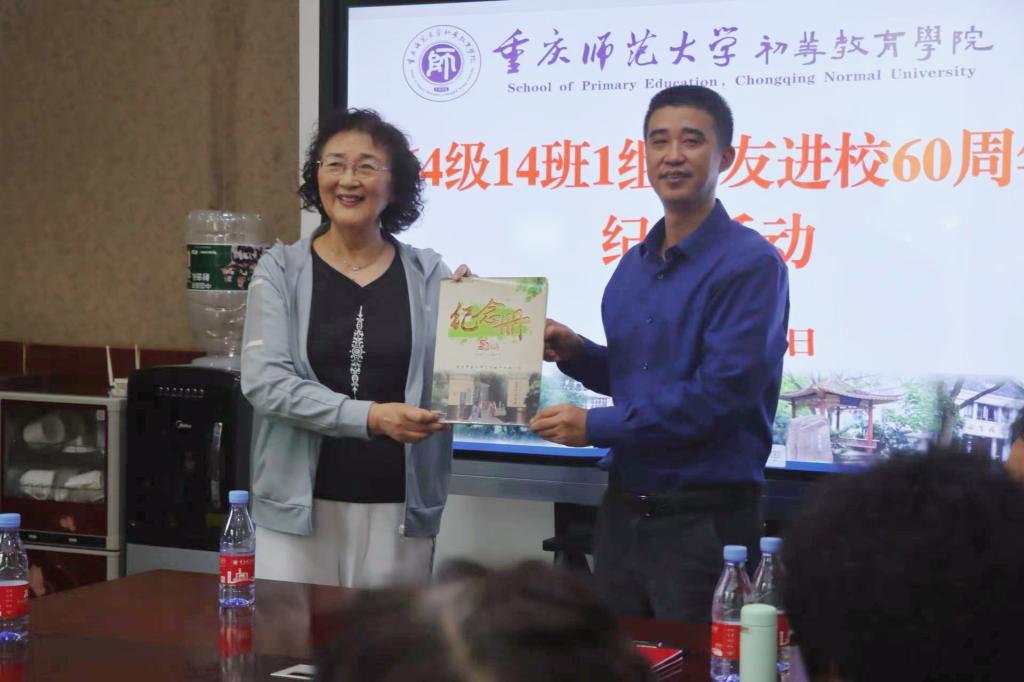最后,校友黄炜(重庆市观音桥中学退休)代表全班同学为母校赠送纪念册,大家纷纷分享返校感言。他们回忆了自己曾经在校的学习经历和受到的谆谆教诲,讲述了自己从中获得的种种生活经验。其中李致芬校友特别分享了自己的播音经历,她表示,那段时光虽然条件艰苦,但对自己意义重大,并生动讲述了她对母校深沉的热爱与感激。