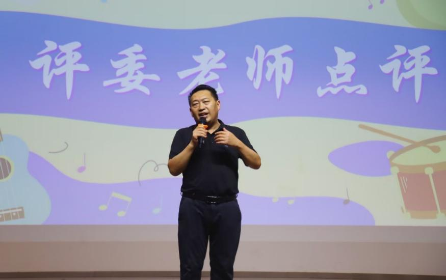 在比赛点评环节,巨志德老师对参赛选手的表现给予了高度评价。他指出,学院以培养“全面发展,一专多能”的新时代高素质小学教师为目标,要求师范生素质“五能五会”和“十项全能”,很高兴看到同学们展现出扎实的艺术功底和全面的才艺素养。针对选手们的具体表现,巨老师提出了两点专业建议:在选曲方面可以更加大胆,多选择一些节奏明快、富有青春气息的歌曲,充分展现当代大学生的朝气与活力;其次,要注重舞台表现力的全面提升,包括台风训练、背景设计等细节的打磨,让表演更具观赏性和感染力。
